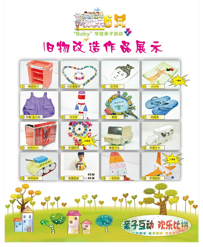 本次親子活動(dòng)分兩部分,活動(dòng)一:舊物DIY+投票評(píng)選(現(xiàn)場(chǎng)投票)。利用廢舊物品做舊物改造,材料不限,樣式不限?;顒?dòng)通知一出,大家踴躍參與,員工與寶貝們一起參與制作,材料選取生活周邊素材,環(huán)保又有趣,最終總共提交了16份作品。作品樣式五彩紛呈、趣味十足:有小朋友利用彩紙精心編制了星星一樣的項(xiàng)鏈?zhǔn)宙?,那里面一定藏著小姑娘一個(gè)七彩星星夢(mèng);有小朋友利用紙筒紙張制作了主題為”中國(guó)夢(mèng)·北斗夢(mèng)“的“星通號(hào)“火箭,好一個(gè)氣勢(shì)磅礴的夢(mèng)想;有小朋友跟媽媽一起做了一個(gè)五顏六色的花鐘,提醒大家,時(shí)不我待,要珍惜時(shí)間??!有小朋友利用各種飲料罐做成了輪船、戰(zhàn)車(chē),這該是一個(gè)強(qiáng)國(guó)的夢(mèng)吧?還有小朋友利用各種材料做成了盒子、拖鞋、購(gòu)物袋、收納盒……真是居家的好寶寶……