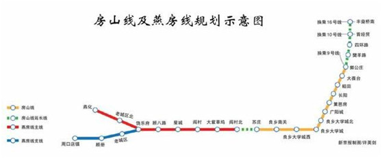 燕房線列車最高運行時速80公里,每列4輛編組,定員960人。線路全長16.6公里,共設9座車站,在閻村北站與房山線換乘。