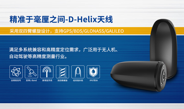 “D-Helix™全球通天線”實現(xiàn)GPS、GLONASS、BDS、Galileo四大衛(wèi)星導航系統(tǒng)全頻段組合,同時支持星際差分L-Band信號。天線單元增益高達4dBi,其優(yōu)異的低仰角性能保證天線在遮擋環(huán)境嚴重、信號干擾嚴重的作業(yè)環(huán)境下實現(xiàn)高精度作業(yè)。目前在無人機植保、無人機巡線、無人機安防等領域得到大批量應用,產(chǎn)品性能得到進一步檢驗。