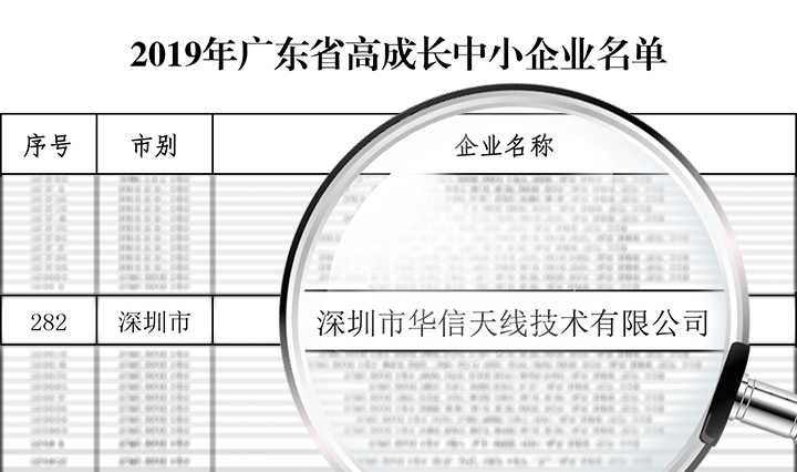 日前,廣東省經(jīng)濟(jì)和信息化委公布了“2019年廣東省高成長(zhǎng)中小企業(yè)”名單。其中,華信天線憑借近年來(lái)的高速發(fā)展,成功入選并榮獲“2019年廣東省高成長(zhǎng)中小企業(yè)”稱(chēng)號(hào)!獲此殊榮,是省政府主管部門(mén)對(duì)華信天線多年來(lái)自主創(chuàng)新研發(fā)能力、成果轉(zhuǎn)化能力、市場(chǎng)競(jìng)爭(zhēng)力的全面肯定。
